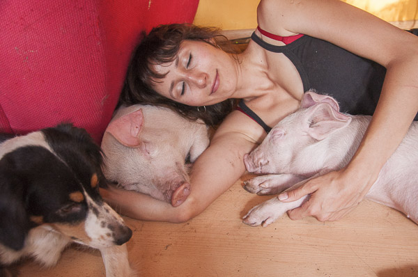 Gary y Oliver llegaron a un hogar donde ya había animales rescatados: Una gatita que Marisol rescató desde lo alto de un árbol, que hace pocos días había tenido a cuatro bebés. Otros tres gatitos que había rescatado Ariel, y que se sumaban a su gran compañera, la perrita Nena. Trabajando con el grupo de activistas, conocimos en primera persona la realidad que viven vacas, cabras, ovejas, cerdos, gallinas y pollitos. Viajábamos casi todos los fines de semana a documentar todo tipo de crueldad contra los animales dentro de la industria ganadera. Los otros días en casa, Gary y Oliver nos enseñaron que una vez superado el miedo, los traumas y la locura inducida por el encierro; los cerditos son tan inteligentes, cariñosos, sensibles y únicos como los perros y gatos que forman parte de nuestras familias.